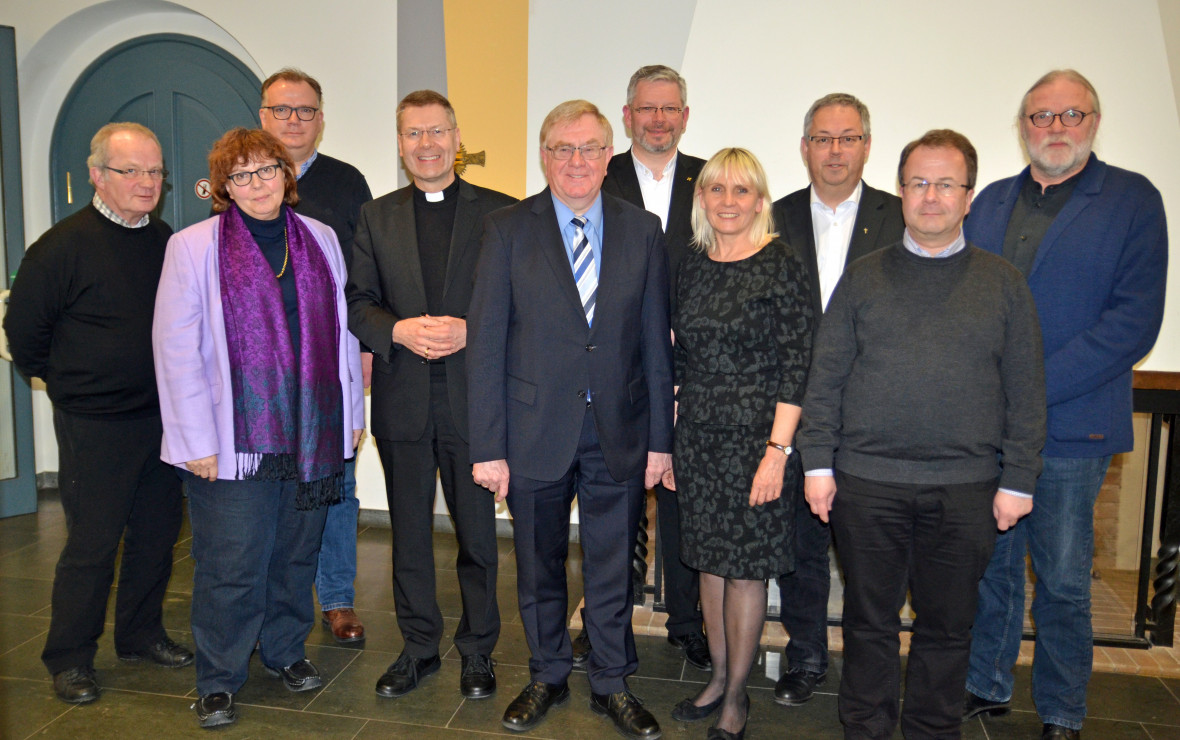 v.l.: Heinz-Josef Schulze-Kappelhoff, Astrid Birkhahn, Martin Arnst, Weihbischof Dr. Stefan Zekorn, Reinhold Sendker, Dechant Karl Kemper, Elke Duhme, Kreisdechant Peter Lenfers, Dechant Michael Mombauer und Michael Spanke„Ich kenne keine Pfarrei im Kreisdekanat, die sich nicht für Flüchtlinge engagiert“, lobte Weihbischof Zekorn zu Beginn des Gesprächs das ehrenamtliche Engagement. Durch die vom Bistum geschaffenen Stellen zur Koordinierung der Ehrenamtlichen könne dieses Engagement genau an den richtigen Stellen eingesetzt werden. Dem Lob schloss sich Landtagsabgeordnete Astrid Birkhahn an. „5000 Flüchtlinge kreisweit, das ist eine neue Gemeinde Beelen“, stellte sie einen Vergleich auf. Durch die reibungslose Zusammenarbeit aller Parteien sowie einen ständigen Informationsaustausch sei es gelungen, ein Flüchtlings- und Integrationskonzept für den Kreis Warendorf aufzustellen. „Wir wollen die Integration über die Arbeitswelt nach vorne bringen. Wir wissen, was wir zu tun haben“, erkärte Birkhahn.